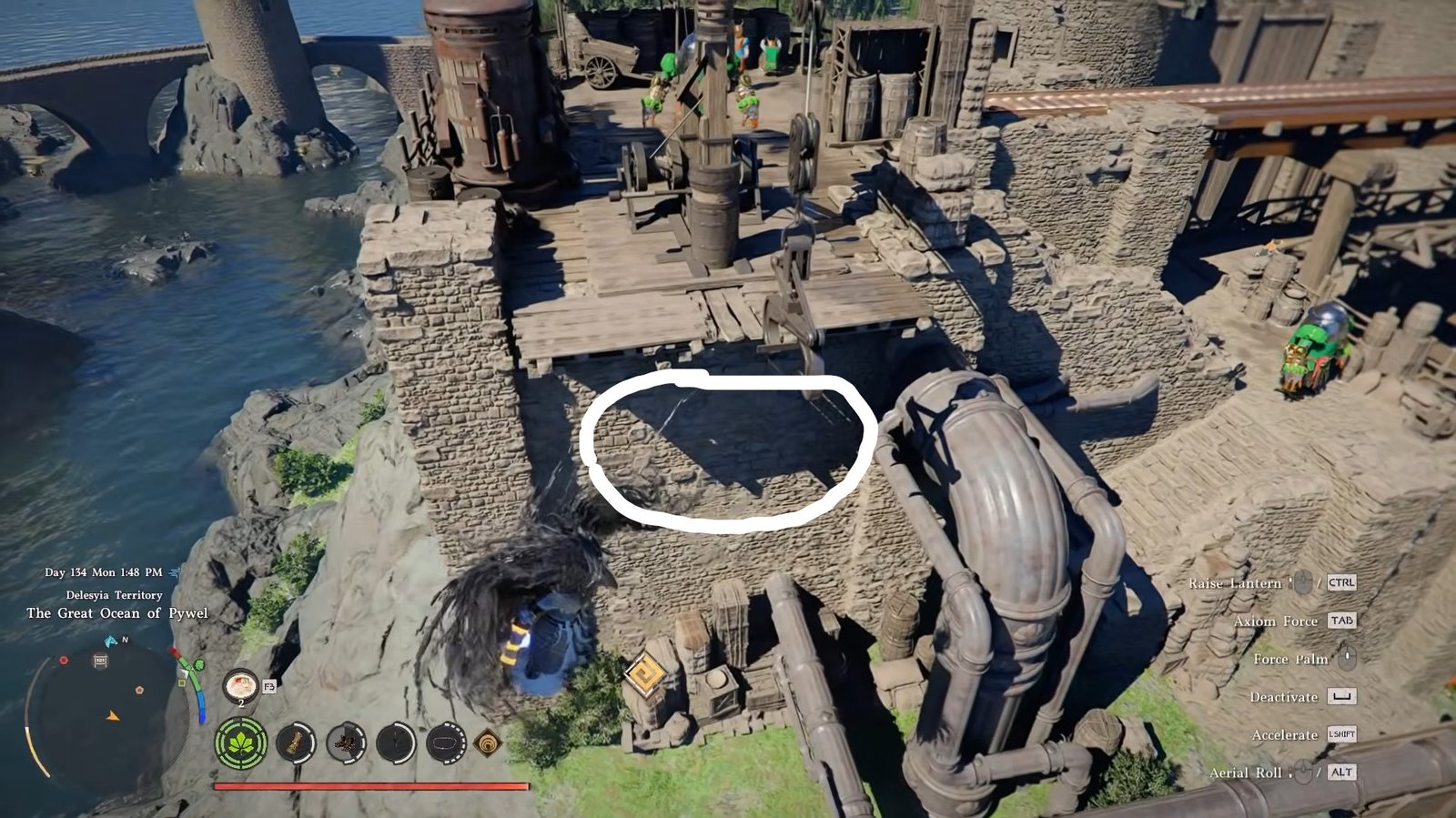 To avoid this, equip the Visione helmet before approaching the gate. This allows you to pass through without trouble. Once inside, head to the left side of the area and make your way toward a raised platform. Using high jumps or climbing, reach the platform and interact with the false wall there.
