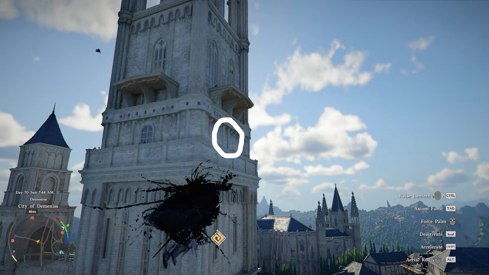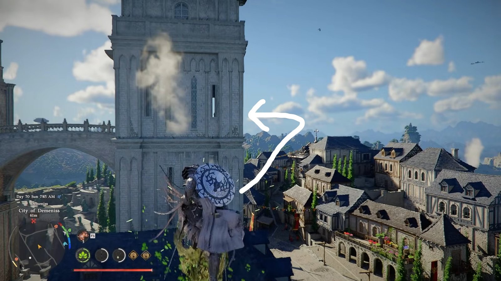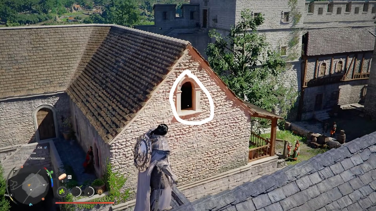 Look for a structure with an archway, then move above it toward a window. Carefully climb onto the window and open it to get inside.