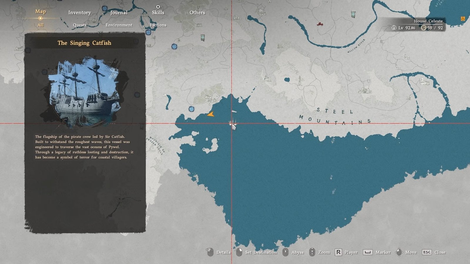 To get the Pirate King Hat, travel south of Hernand toward the water where a pirate ship called the Singing Catfish is located.