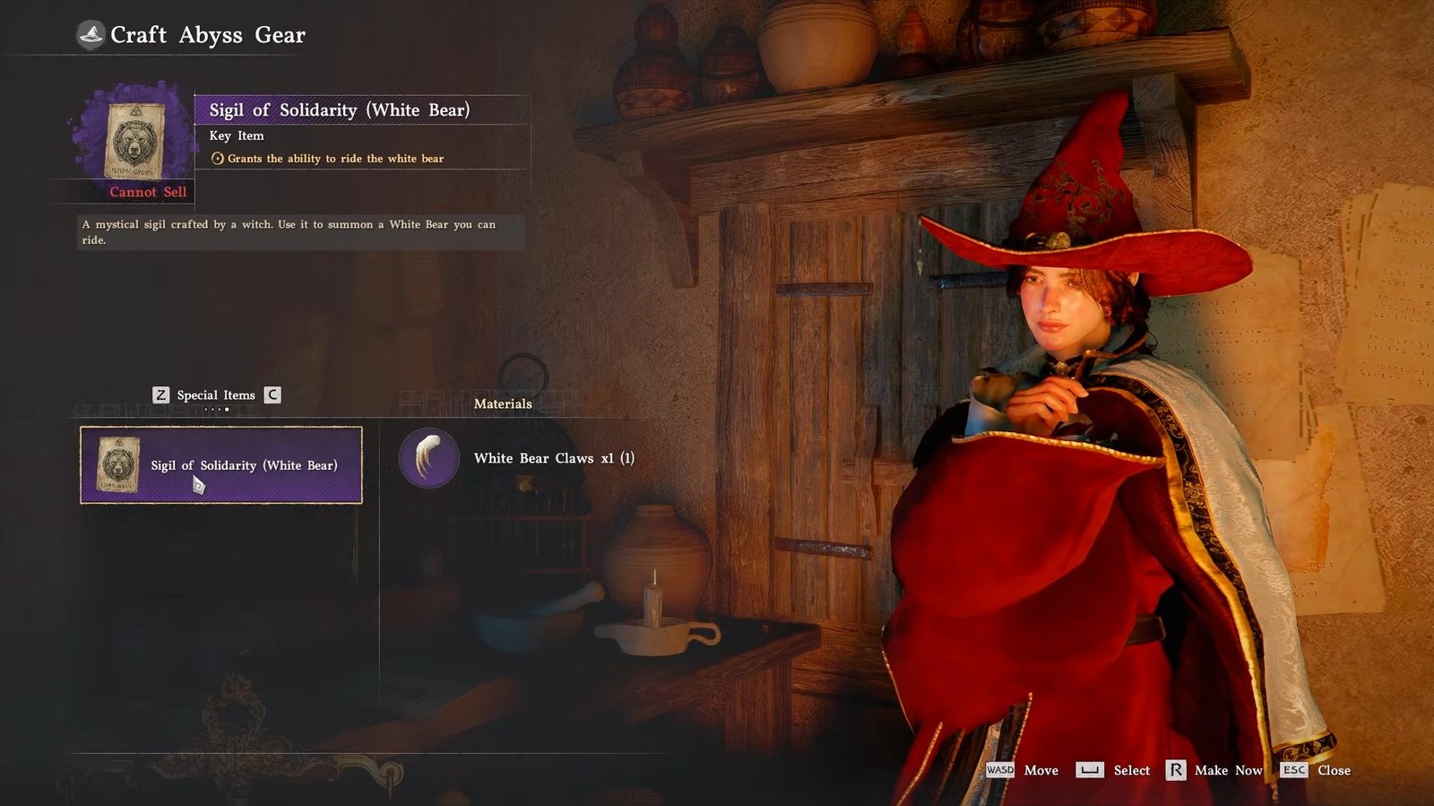 Take the claws to any witch except Sylvia and open the crafting menu. Select “Craft Abyss Gear,” then move to the Special Items section. Here, you will find the option to create the Sigil of Solidarity (White Bear).