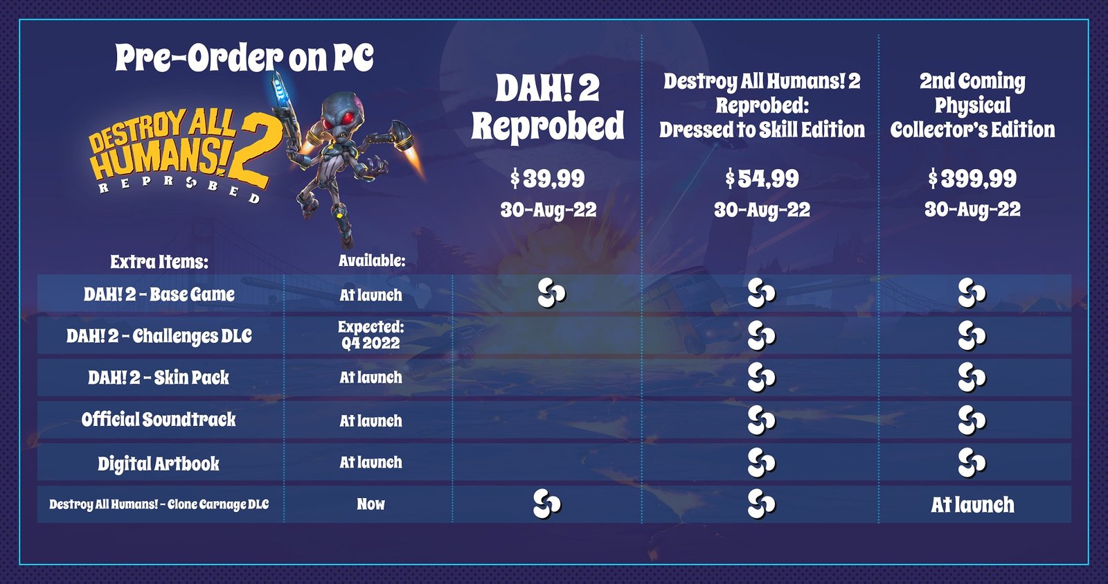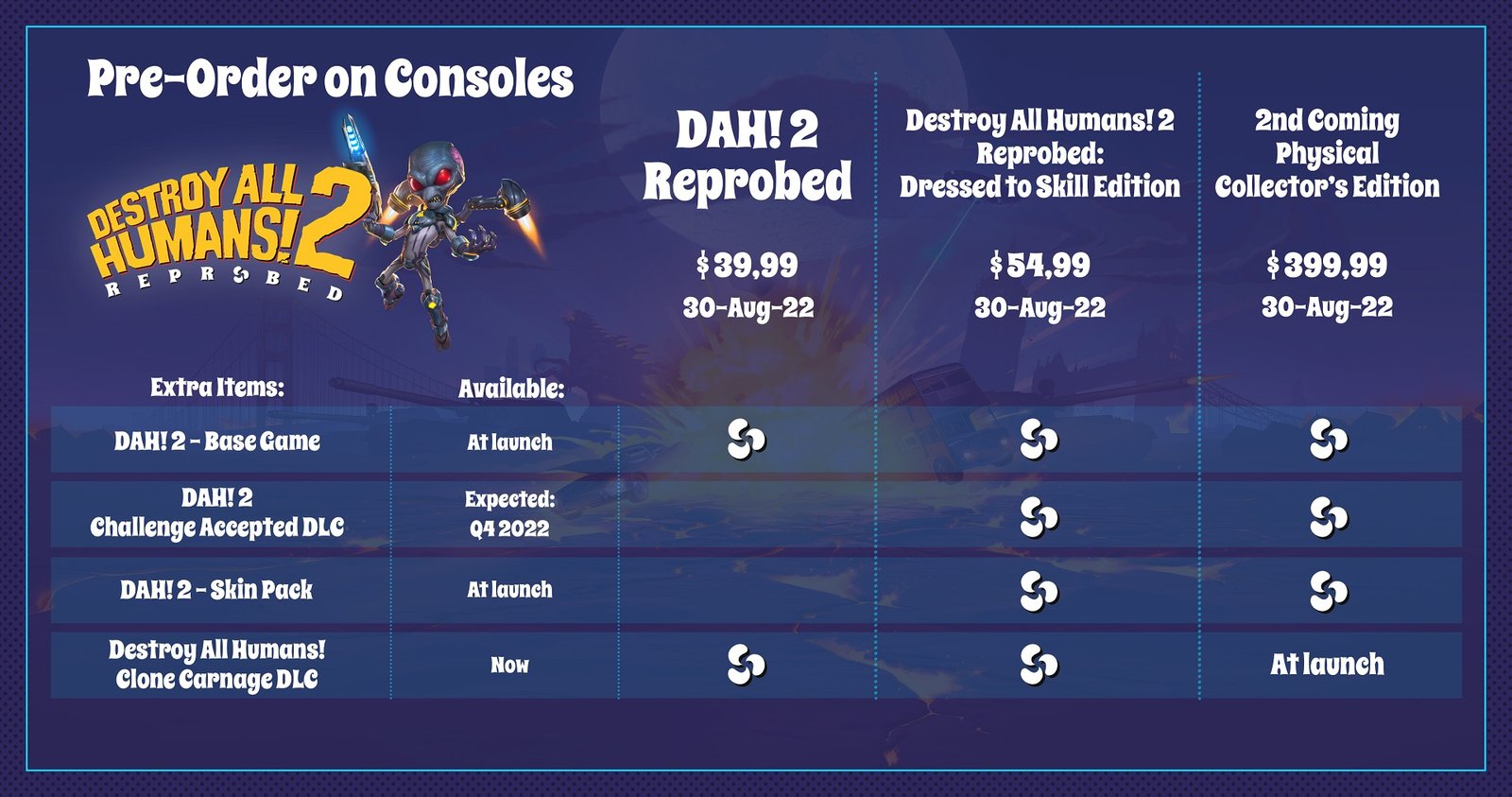 Destroy All Humans! 2 – Reprobed is slated for release on PS5, Xbox Series X|S, and PC via Steam, Epic Games Store, and GOG. Digital pre-orders are now live across all platforms so you can pre-order your digital copy right now on the platform of your choice. The standard digital edition will set you back $39.99 however the Dressed to Skill Edition will set you back $54.99. Pre-ordering right now will give you access to the Clone Carnage DLC for the original Destroy All Humans! You can check out what is included in each edition below: