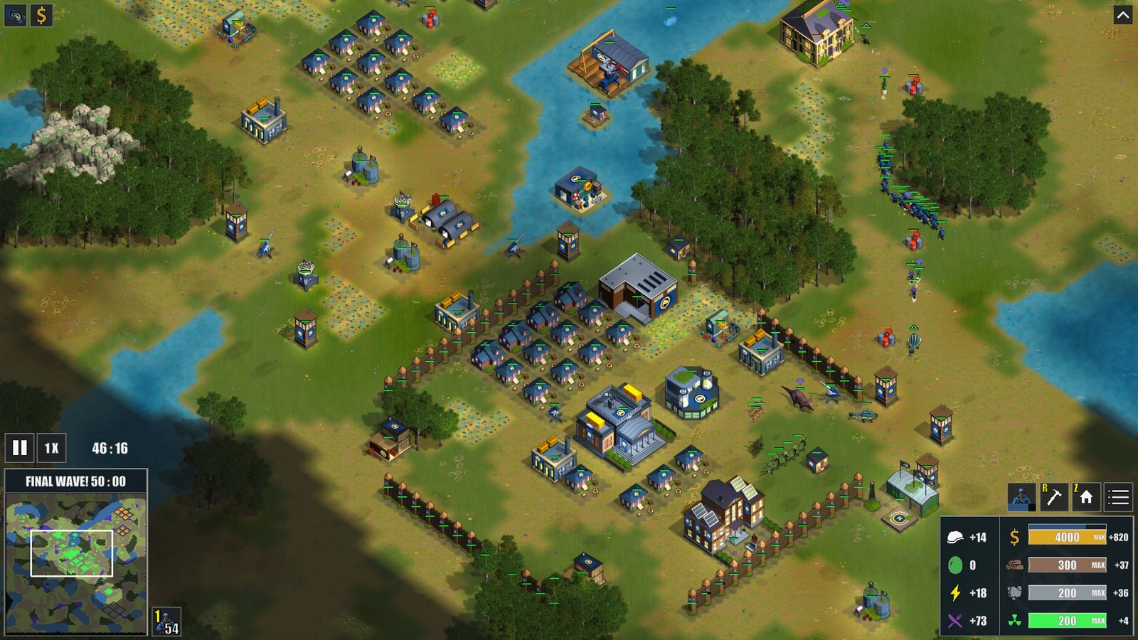 Repterra gives you freedom on how you want to expand your base. Your base is more of a settlement-military installation hybrid, as you will build houses, farms, resource collection buildings like wood, ore, or uranium collectors, and also structures like barracks, dinosaur production facilities, walls, defenses, and other combat buildings. You can expand to your liking if you can farm enough resources, and the game handles it pretty well. In nearly all levels, you start with a basic amount of units and buildings, but you can start resource production to expand, research new buildings and units, and finally create an army to begin your dinosaur hunt. Each map is littered with dinosaurs, with occasional smaller waves attacking you before the timer hits the full wave’s timer limit.
