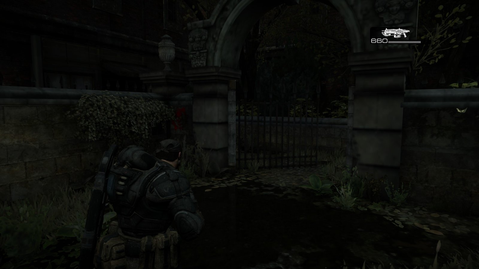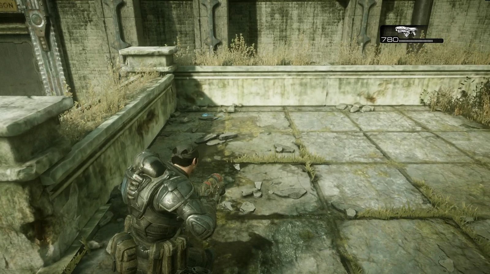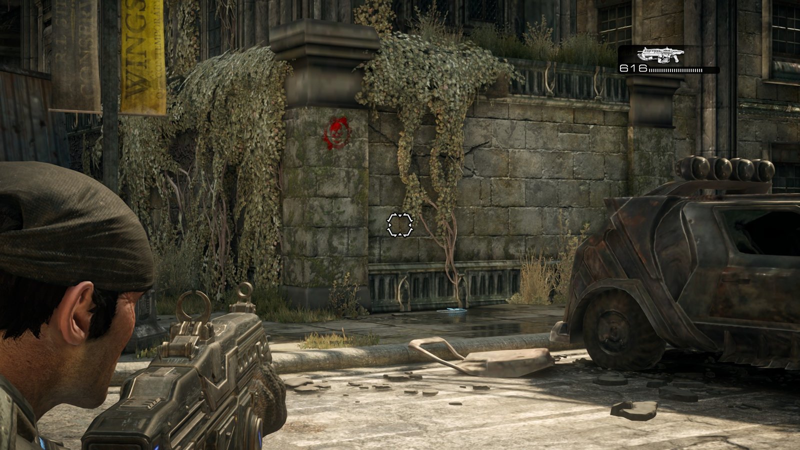 When you have your first proper gunfight after Locusts burst through the gate, go back to this arena and check the right side. You will find some ammo along with another Cog Tag.