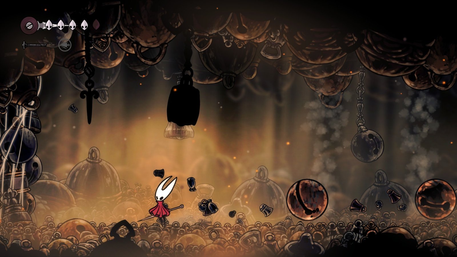 In the mix, the Bell Beast will often bust out of the ground and shriek, which will shake the whole room, and some chimes will fall down from the roof as well. These chimes will disappear after a few jumps, so all you need to do is avoid them long enough for them to go away on their own. From the roof, light and dust will come out, which will give you an idea about where the chimes will drop from, so keep an eye on the roof when the Bell beast roars for this attack.
