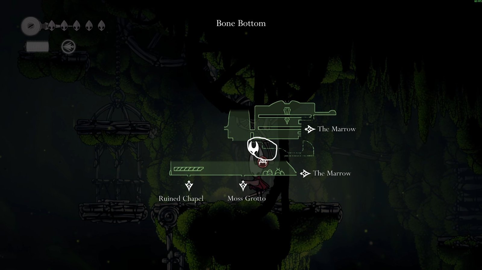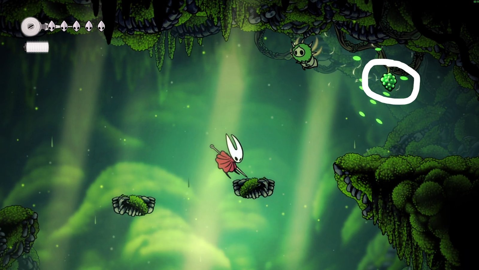 The third Mossberry you can obtain is near the elevator, which joins Mosshome with Bone Bottom. It is located in the lower-left section of Mosshome, below the area where we farm for Rosary Beads. From this elevator, move to the right section and keep looking down at the platforms. The flying enemy holding this Mossberry is flying beneath these platforms. On the right side, there is a smaller platform that gives enough open space for you to dive attack and get the Mossberry.