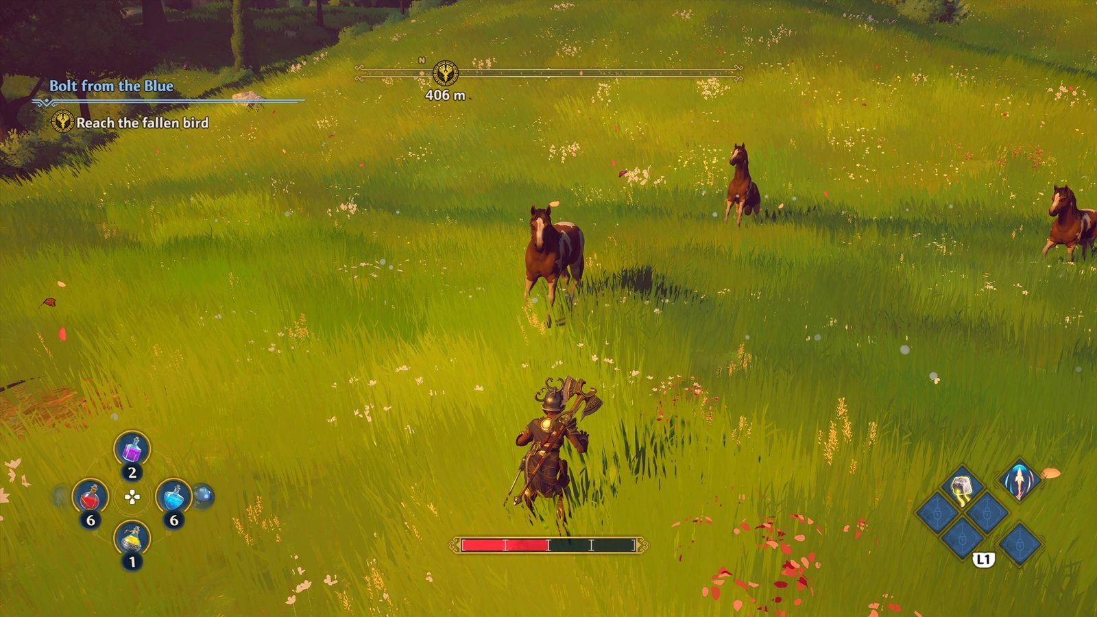To tame an animal, the very first thing you have to do is crouch and approach them slowly. If you see them moving restlessly, quickly stop, and give them some time to ease up to your presence. Once the animal is fine, move ahead while quickly watching their actions and slowing and stopping accordingly. Once you can close to the animal, you can press the button to tame them and start riding them. Once tamed, the animal is always found in your inventory in the ‘Mounts’ slot above your Quest items. You can press and hold Triangle anywhere to call your mount.