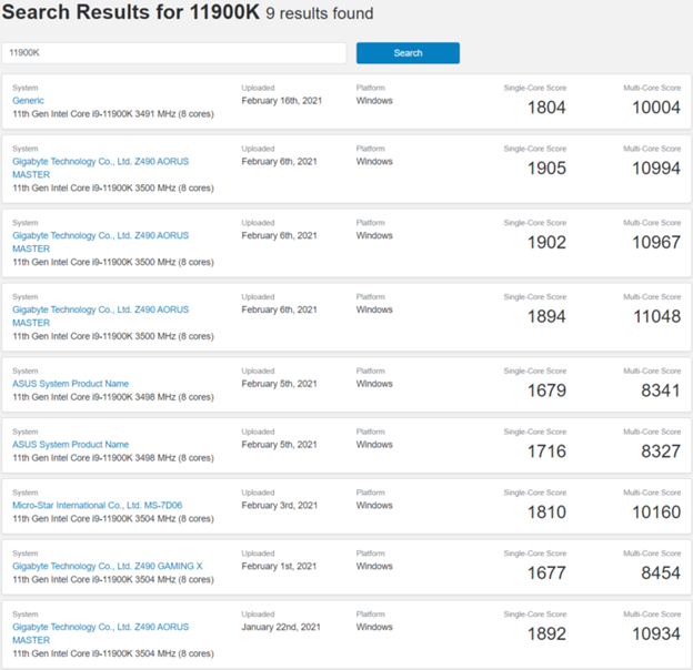 Benchmarks of 7 different Rocket Lake desktop CPUs have appeared on Geekbench which include the Core i9-11900K, Core i9-11900KF, Core i7-11700K, Core i7-11700, Core i5-11600K, Core i5-11500, & the Core i5-11400. All of these processors were tested on either a 400 series or 500 series chipset motherboard.