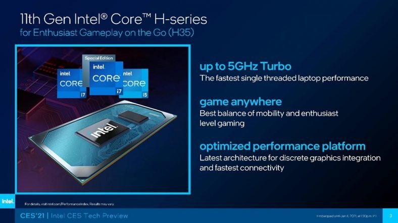 Intel launched a new line of 11th Gen Intel Core H-series mobile processors for gaming that extends the 11th Gen mobile family of products and pushes the limits of what’s possible for enthusiast-level gaming in laptops as thin as 16 millimeters. Led by the Intel® Core™ i7 Special Edition 4-core processor with up to 5 gigahertz (GHz) Turbo, these H35 processors are specifically targeted for ultraportable gaming. They feature new Gen 4 PCIE architecture for connecting to latest discrete graphics and deliver amazingly low latency and immersive game play on the go. At CES, Acer, ASUS, MSI and Vaio announced new systems powered by the 11th Gen Intel Core H35-series processor for ultraportable gaming, with more than 40 designs from top manufacturing partners launching in the first half of 2021.