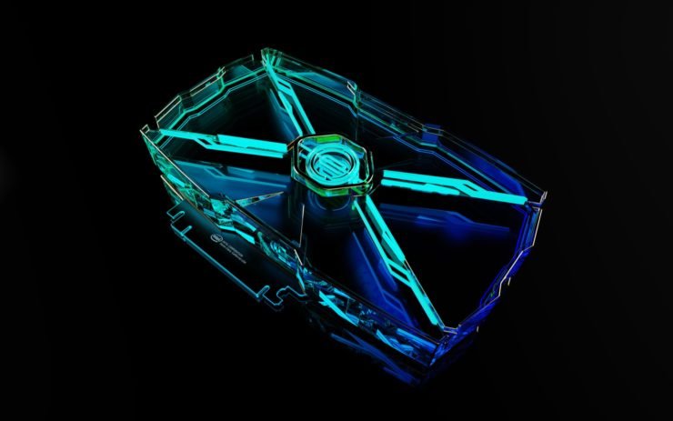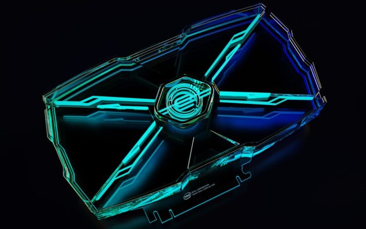 This is a rather traditional kind of Intel Xe graphics card concept. You could think of this as a mini variant. There is a small fan in the center and all the lighting does make it look very fancy indeed.
