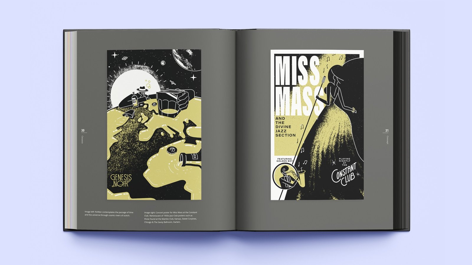 The centerpiece of the collection, “Noir — The Collected Artworks of Genesis & Nirvana Noir,” elevates the digital art of the Noir series into a tangible masterpiece. This hardback book boasts premium qualities, featuring indie gaming icon No Man with a reflective silver finish. The book is bound with black spine tape, showcasing stunning 150gsm Arctic Matt paper stock.
