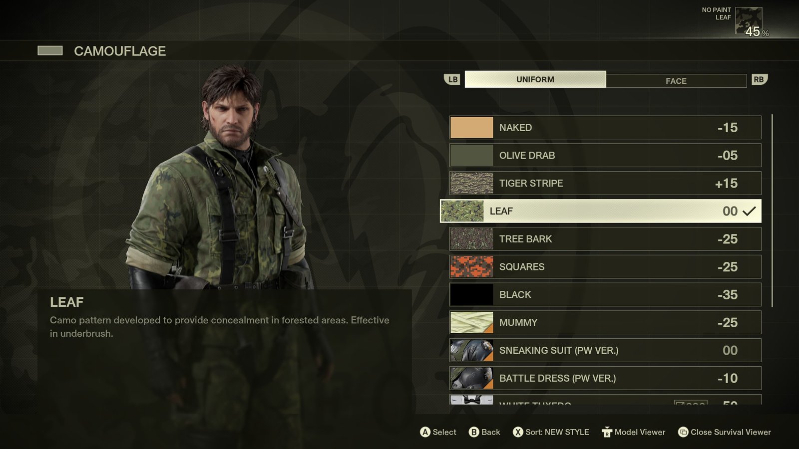 Metal Gear Solid Delta features 59 Camouflage uniforms and 25 face paints. We have detailed both of them separately below: