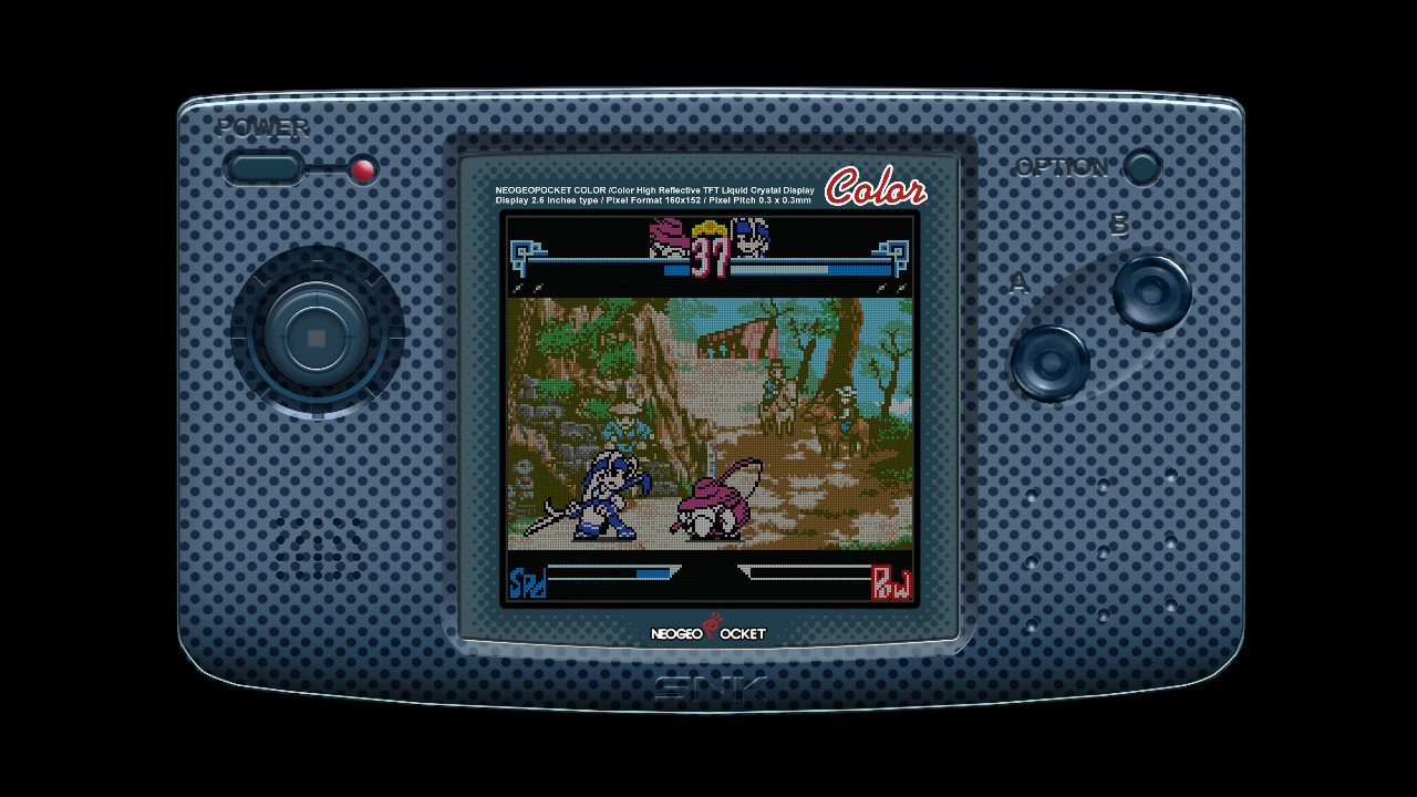 Right from the first screen of the game as soon as it gets loaded, you see that the game is played inside an actual Neo Geo Pocket Color console. The game screen is pretty small and it tries to deliver an as authentic experience of the original console or arcades as possible. You can change the skins of the console to match your own taste however the visuals of the game and the sound design remain the same. The screen offers the same 16-bit colors and the audio design from the original game however, you can increase the brightness of the game from the console menu. It’s not too much different but if you do not like the original low-brightness screen, you can go for the more bright one.
