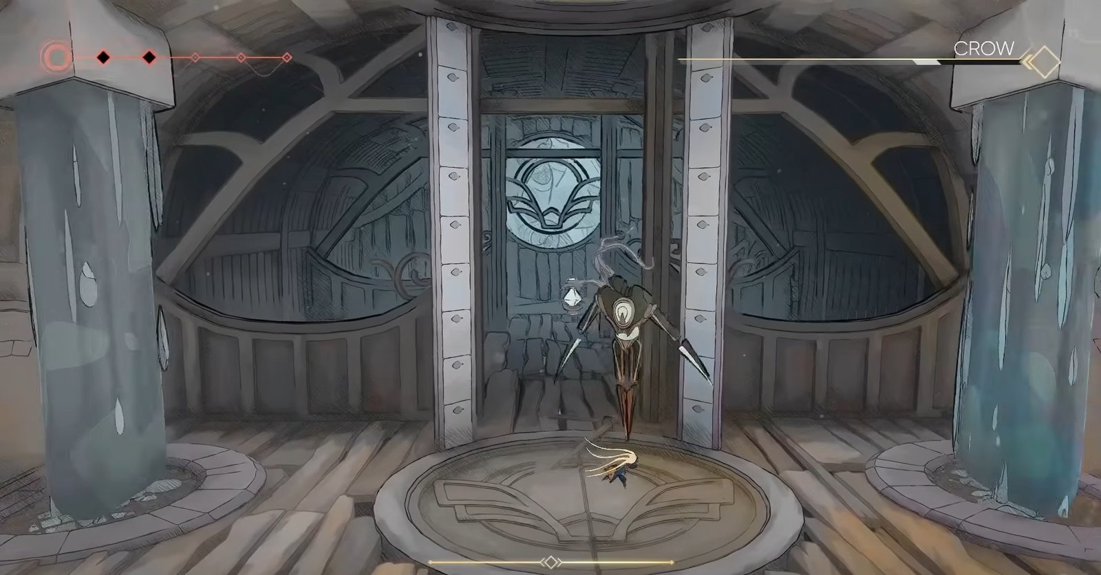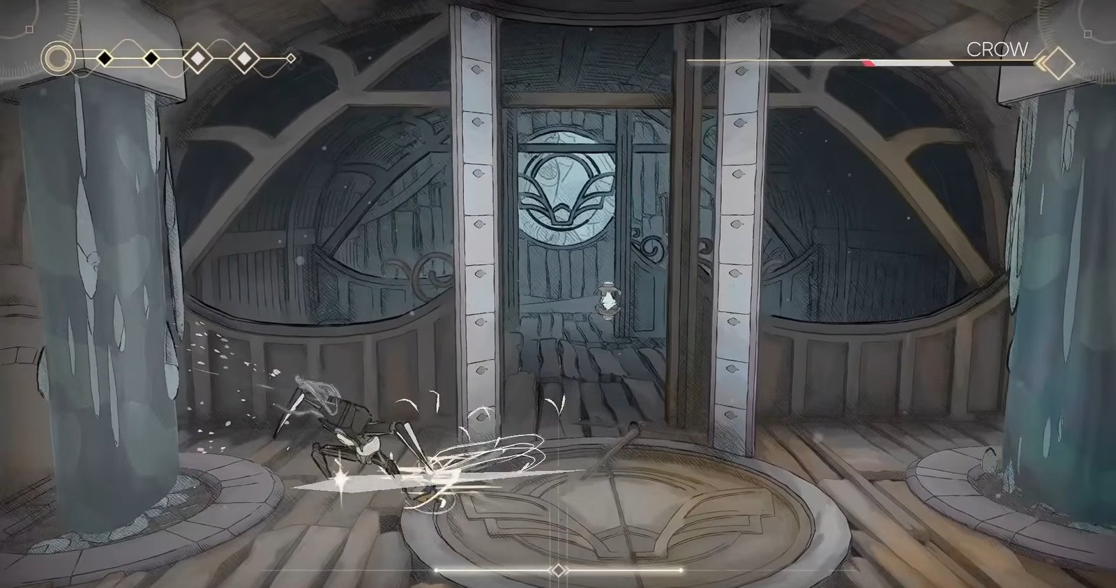 As the fight progresses in the second phase, Crow will pause briefly in the center of the arena while water begins flowing in from both sides. This permanently reduces the space you have to move. While she remains still during this moment, you should take the opportunity to land a few hits before the arena becomes more difficult.