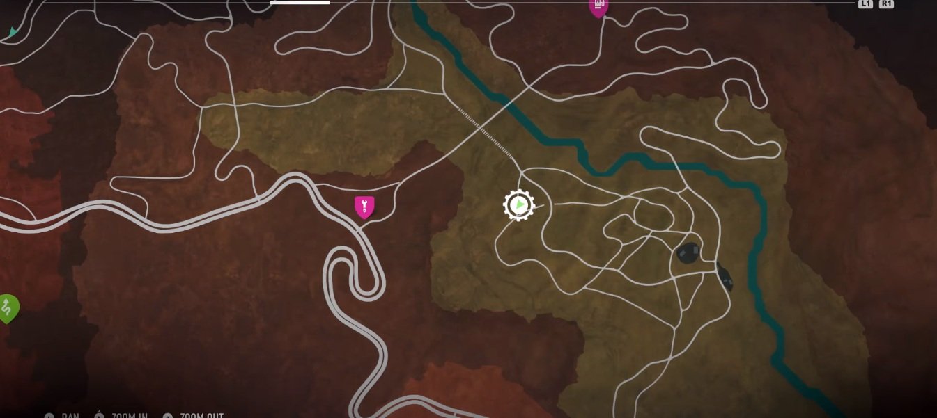 The location to collect the last part for the build of this car is shown on the map above. The location is straightforward, facing south, the track will lead you to a ramp that you have to jump and cross over a cliff. You will find the part right where you land, again with a fire burning nearby.