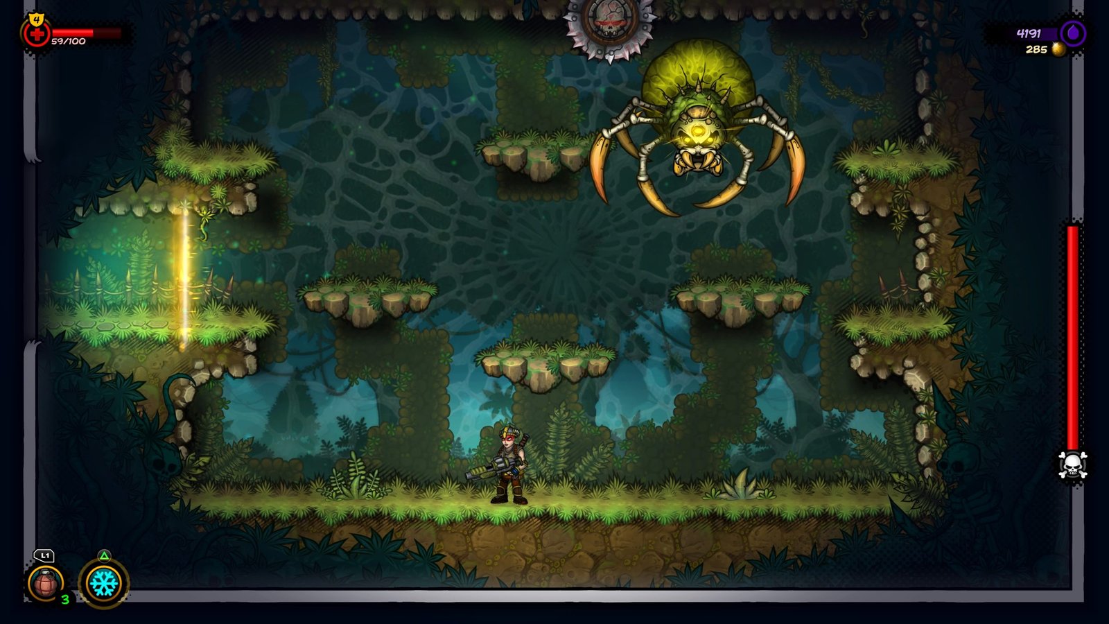 Coming to the gameplay of Fury Unleashed, it is brilliant and every move is fluid-like. You have tons of moves up your sleeve apart from the normal moving and jumping. You have a double jump, sprint, and stomp attacks. For close-ranged combat, you have your melee weapons and for ranged enemies, you have a plethora of ranged weapons at your disposal. You also have an ultimate ability as well as a thrown explosive in your inventory. To make your character even more powerful, you can purchase armor from different vendors or equip them after you uncover hidden chests in the levels. As you level up, you can unlock even more skills and upgrades from a detailed skill tree. All of these options allow you to have the ultimate badass character suiting to your playstyle.