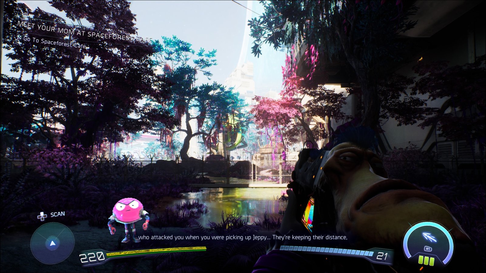 As you hunt down the bounties, you explore beautiful locations and cause mayhem. Naturally, there are tons of cool boss fights as well, with some unique gameplay elements thrown in the mix. Probably the most unique boss battle in the game is the Senator Muppy Doo, one of your bounties, who manages to shrink himself and gain access inside your suit. The boss battle begins on the outside but concludes with you switching between different menus in the pause menu, and ultimately, you stabbing yourself in the face with Knifey. It is such a wild design for a boss battle that only Squanch Games can pull off perfectly with their sense of humour and good level design.