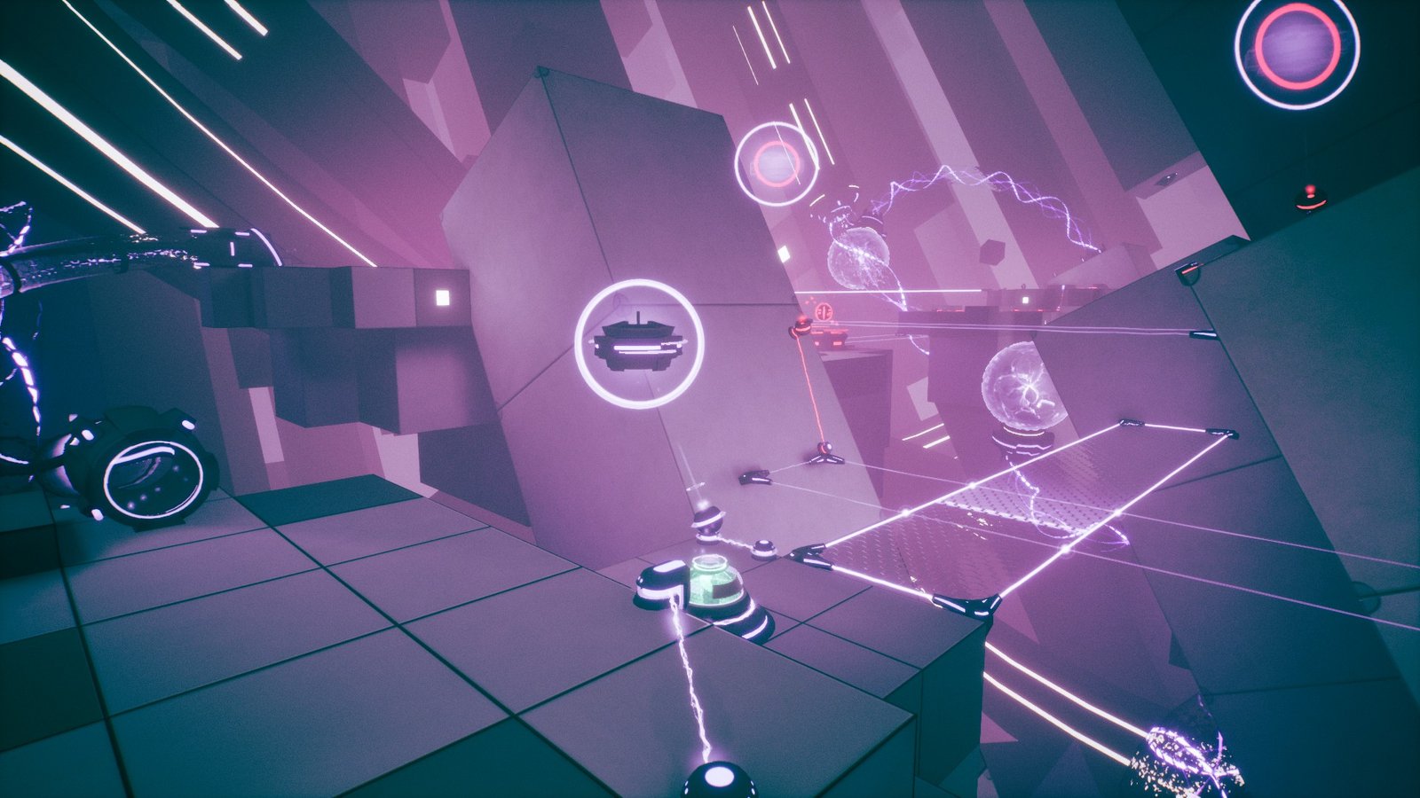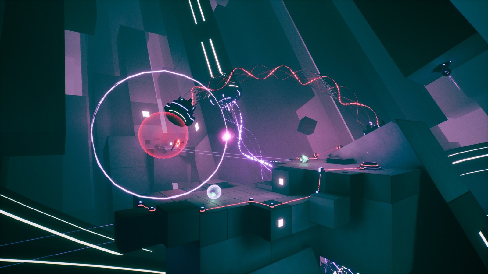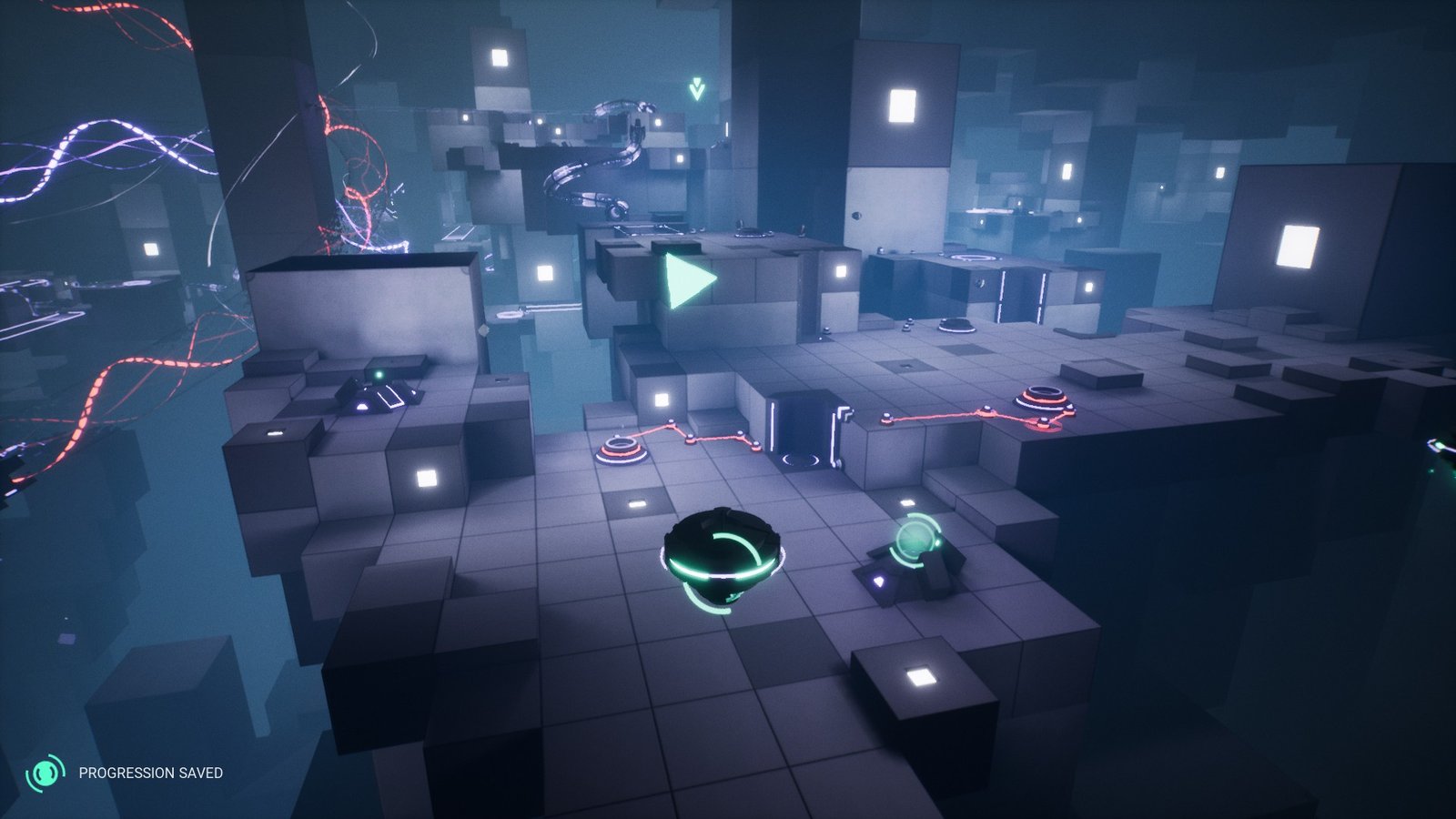I love the art style of Orbyss. The world does not offer a lot of colors, and you will mostly find the levels filled with red, white, and a blend of greenish-blue hues. As you complete rooms, they will turn into the friendly green-blue hue, while unsolved areas will mostly have red. This distinguishes between completed rooms and rooms that you have yet to solve as you look around. The game does not feel empty at any point, thanks to its open-world design. It is not really an open-world design, and you are limited to the current puzzle room, but as you move around and look around, it feels like you are inside a huge, interconnected world with different rooms and pathways linking to each other. The level design is mostly just switches, mechanical devices, platforms, and solid ground areas, but they are integrated very well, giving a sort of organic cyberpunk feel.