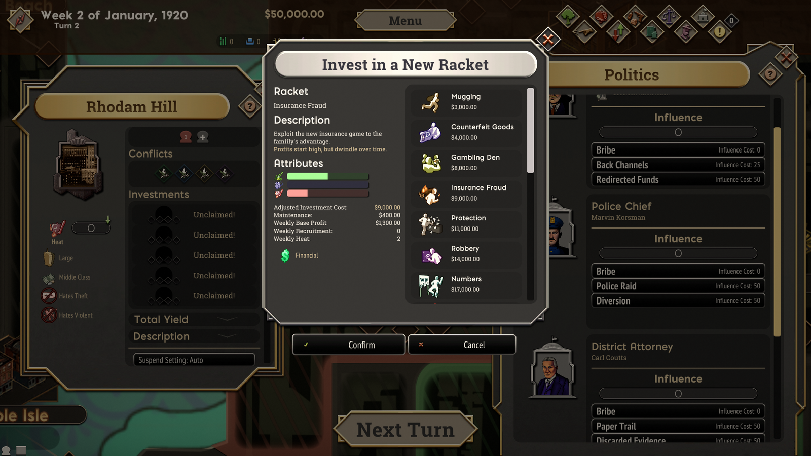 The Commission 1920 is a turn-based strategy game which is set in the 1920s in New Shore when organized crime was at its peak. You take on one of the five mob families and step in the shoes of a Don who must grow and expand his crime circle while making sure that none of the other companies overtake his own family. Each of the family comes with its own unique traits and Dons. Each family also has its way of operating and handling various situations which makes a playthrough with each family unique and eventful in its own way. However, all families grow and expand via owning rackets and expanding them in the city while making sure that the government keeps an eye away from them.