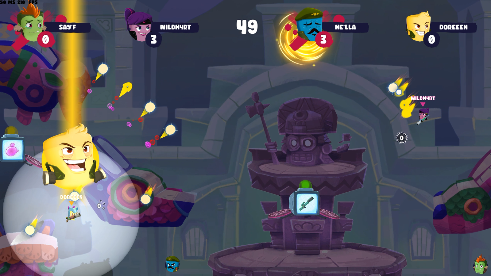The Online mode is the most common mode where you will join three other players to fight with each other and the last remaining player is termed the winner. There are five rounds and the first player to secure at least three wins is the winner. For Online with Friends and Couch Party, you can choose from various modes such as 2v2, Couch vs Couch, and even Free-For-All for the ultimate mayhem. The more players in a game, the more fun it is since you are trying to avoid fires from multiple directions. Couple that with various weapons and you have a really tough game to win.
